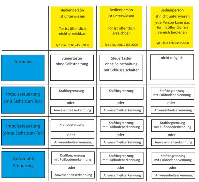 In der EN12453:2000 (zum Stand April 2017 geltende Norm Tore | Nutzungssicherheit kraftbetätigter Tore - Anforderungen) sind unter Punkt 5.5.1 folgende Mindestschutzeinrichtungen an der Hauptschließkante eines Tores festgelegt. Diese sind in Abhängigkeit der eingesetzten Steuerungen und der Art der Bediener unterschiedlich festgelegt. Im Weiteren sind die Anforderungen in einer Tabelle dargestellt, die an Tabelle 1 der EN12453:2000 angelehnt ist.